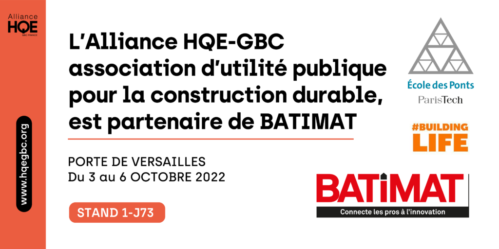 L’Alliance HQE-GBC, acteur d’utilité publique de la construction durable, est partenaire de BATIMAT, le salon multi-spécialiste et international de l’industrie et des métiers du bâtiment qui aura lieu du 3 au 6 octobre 2022 à Paris Expo Porte de Versailles sur le stand Hall 1-J73