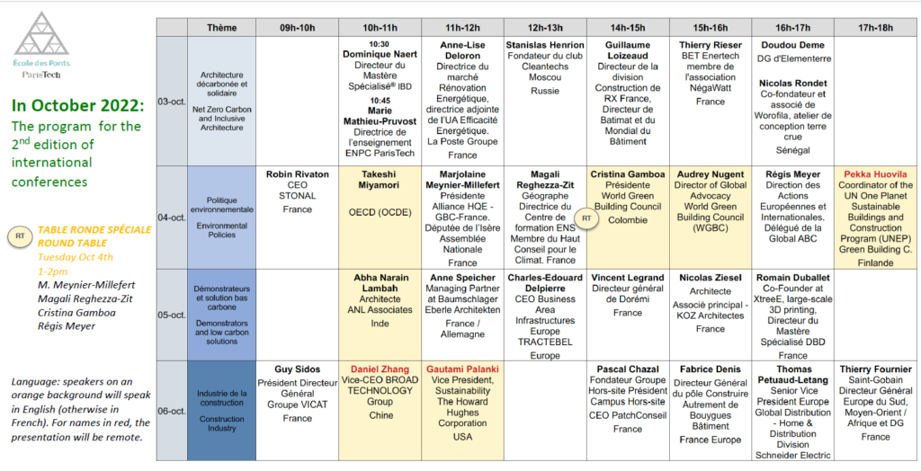 Après avoir participé au Low Carbon Construction Tour 2022 en Afrique et en Europe d’avril à juillet 2022, l’Alliance HQE-GBC sera partenaire du club international et accompagnera les délégations internationales pendant BATIMAT. L’association est également partenaire de l’Ecole des Ponts ParisTech dans le cadre du cycle de conférences du Master Spécialisé® Immobilier et bâtiment durables (IBD), Transitions carbone et numérique avec la participation de sa Présidente Marjolaine Meynier-Millefert.