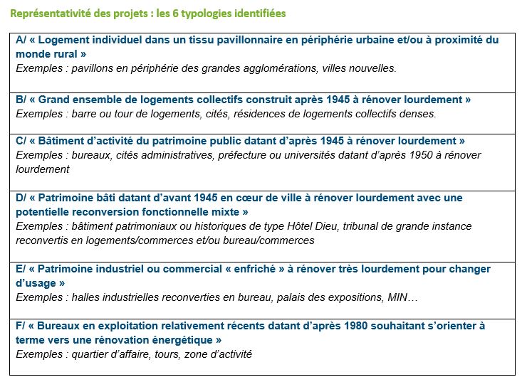 Les bâtiments existants représentent une grande variété de typologies, de morphologies, d’implantations et de contraintes contextuelles. L’enjeu de l’appel à projet est d’identifier des cas d’étude pertinents (bâtiments existant ou en exploitation), à la fois diversifiés et représentatifs du marché français.