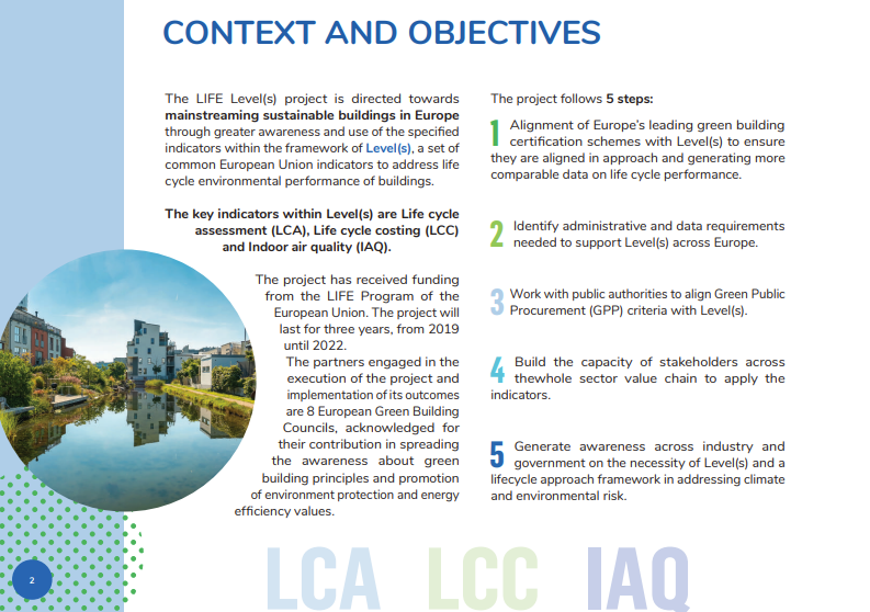 Des dizaines d’experts de huit pays de l’Union Européenne se sont engagés dans la préparation du guide dans le cadre du projet Life Level(s), mettant en avant les différents degrés de durabilité des bâtiments. Le projet encourage les pays de l’Union Européenne à intégrer dans leur législation les critères d’évaluation de performance des bâtiments en matière de durabilité issus du cadre de travail Level(s) de l’UE. Ce dernier tient compte du cycle de vie complet d’un bâtiment, en prenant en compte les étapes de fabrication des matériaux, de construction, d’exploitation du bâtiment, de déconstruction et de démolition.