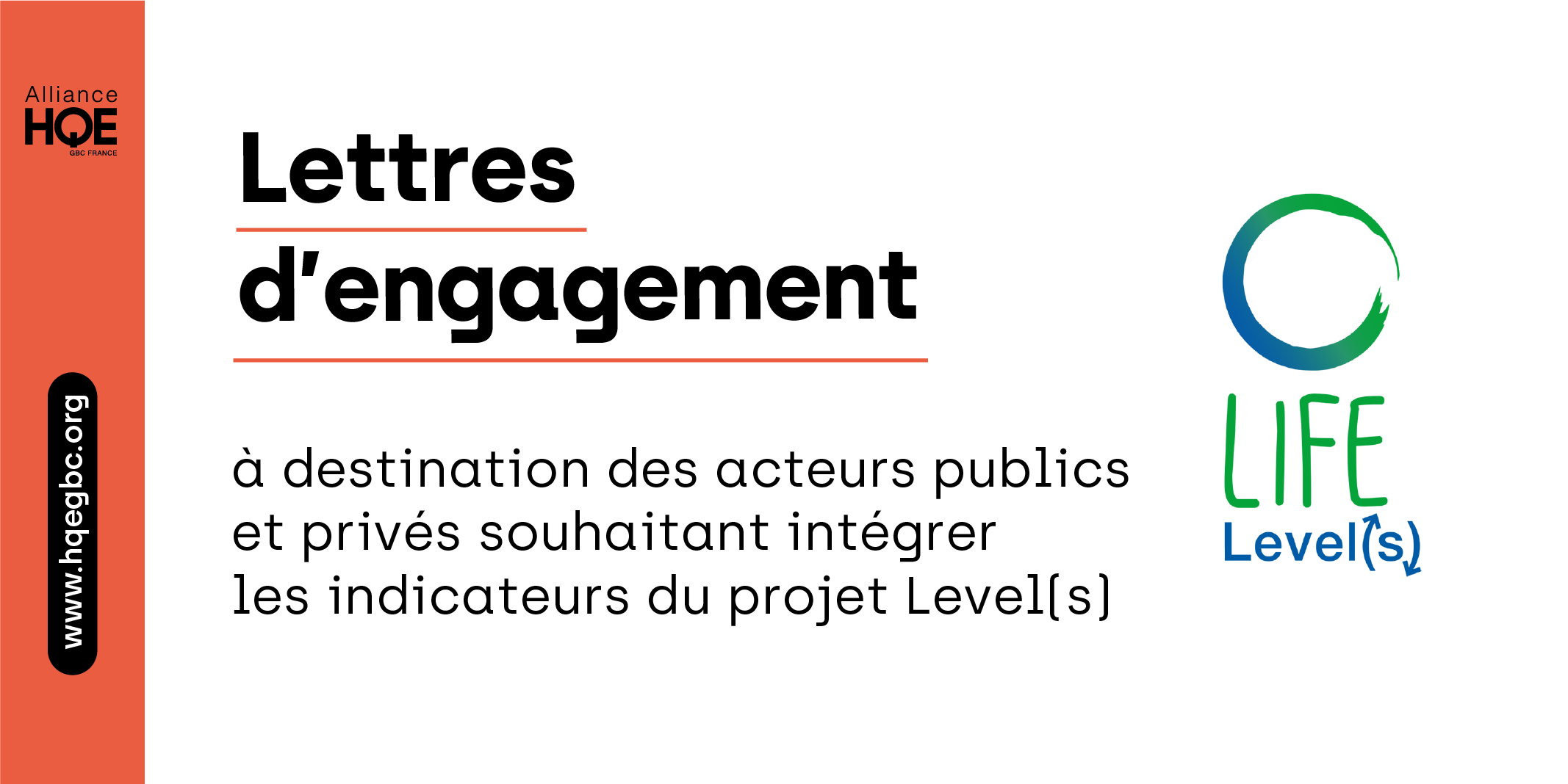 Dans ce cadre, l’Alliance HQE-GBC invite tous les acteurs du bâtiment engagés à signer la lettre d’engagement Life Level(s) et à œuvrer pour des bâtiments plus durables en travaillant avec les indicateurs de coût global, d’ACV et de QAI. Pour vous engager, téléchargez la lettre d’engagement au lien ci-après, remplissez là en cochant les engagements que vous souhaitez prendre et renvoyez la-nous à technique@hqegbc.org et communication@hqegbc.org.