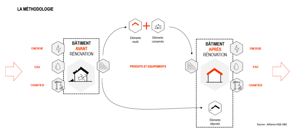 La méthodologie utilisée pour l’étude est celle décrite dans le guide méthodologique ACV Rénovation de l’Alliance HQE-GBC (publié en 2018). Cette méthode basée sur l’ACV E+C- présente les singularités suivantes :