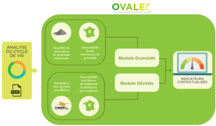 Il permet d’évaluer des indicateurs spécifiques à l’économie circulaire, prenant en compte la localisation du chantier. Plus précisément à ce stade deux modules sont proposés pour l’évaluation, un module granulats et un module déchets.